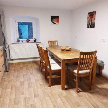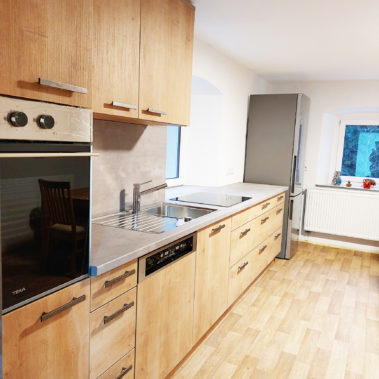 Unsere neue vollausgestattete Küche mit Essbereich, beinhaltet 2 Kaffeemaschinen, Wasserkocher, Mikrowelle, Backofen, Cerankochfeld, Kühl-Gefrierkombination, Eierkocher, Toaster, Mixer uvm. Frischer Kaffee, sowie Kaffeefilter (Erstausstattung) finden Sie kostenfrei bei uns vor.