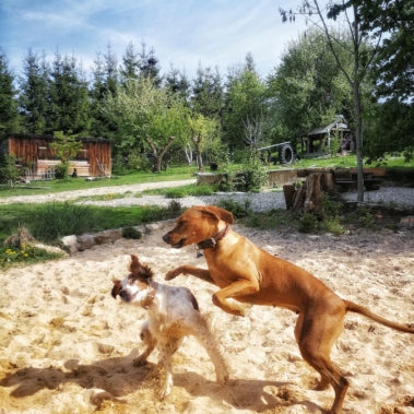 Für die Hunde haben wir mehrere Sandplätze zum buddeln und Spaß haben, Agility Parcour, Spielscheunen, Schnüffelscheunen für die Nasenhunde, Reifenparcour und letztendlich ein wunderschöner riesiger Hundepool (Trinkwasser, Poolzeit von April bis Oktober). Das Gelände ist sicher, und zu Ihrer alleinigen Nutzung, bei uns haben Sie keinen fremden Hundekontakt, dies ist uns sehr wichtig, somit können Sie in Ihrem Urlaub entspannen, relaxen und müssen keine Angst haben Ihren Hund/e frei laufen zu lassen. Unser Motto Leine und Halsband ausziehen und das Leben in vollen Zügen genießen. Sie haben weder mit unseren Hunden noch zu den Hunden der Ferienwohnung Kontakt.