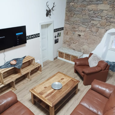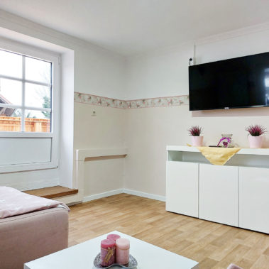 Im Erdgeschoss befindet sich 1 Schlafzimmer mit Doppelbett 180×200 und TV, 1 WC, die Küche und der Vorraum der Küche sowie ein Wohnzimmer